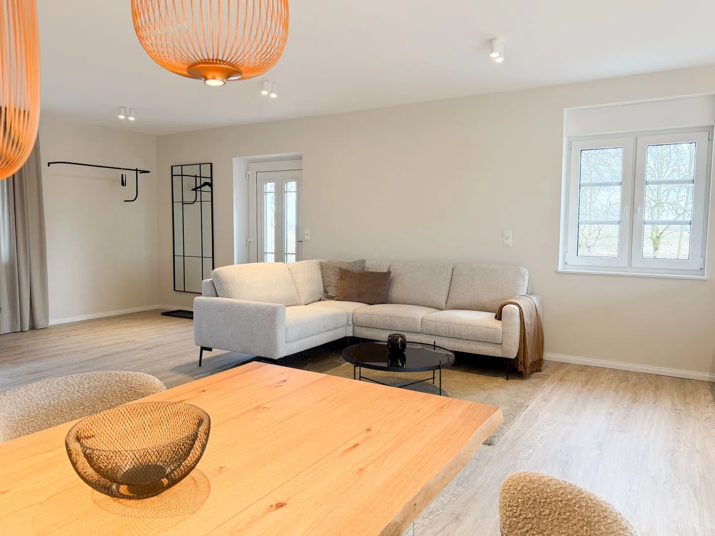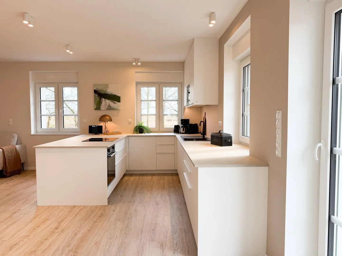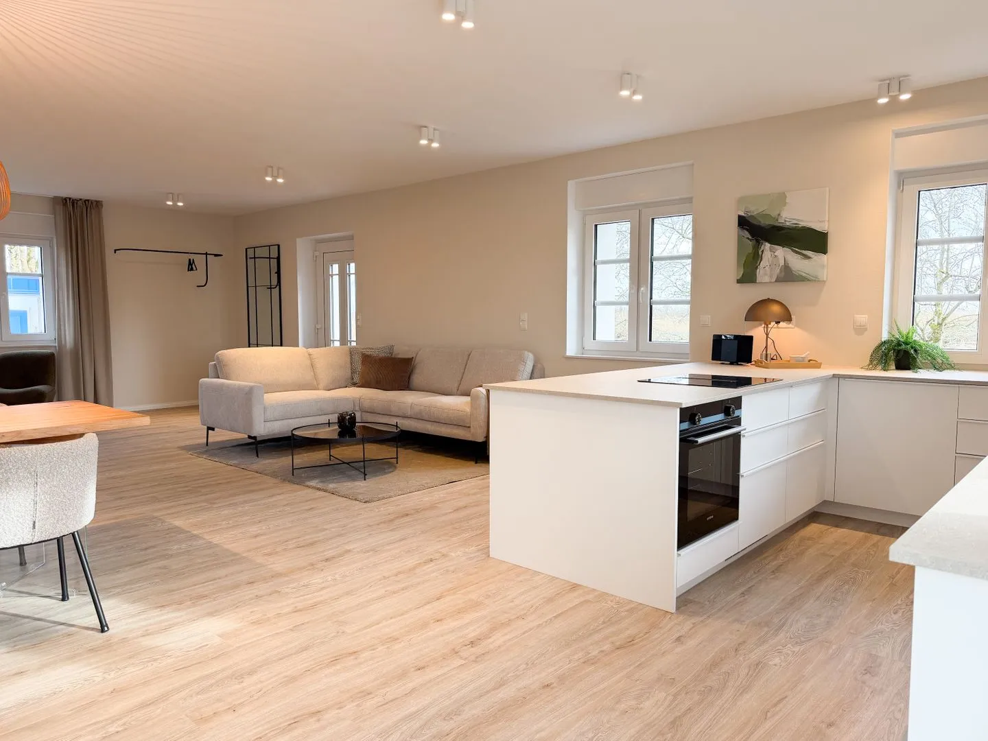 Der offene Wohnbereich bildet das Herz der Wohnung. Küche, Essplatz und Sofaecke gehen fließend ineinander über und schaffen eine entspannte Atmosphäre für gemeinsame Zeit. Ob Frühstück am Tisch, ein ruhiger Abend auf dem Sofa oder gemeinsames Kochen – hier findet alles seinen Platz. Die Küche ist umfassend ausgestattet und macht es leicht, sich auch im Urlaub unkompliziert selbst zu versorgen.